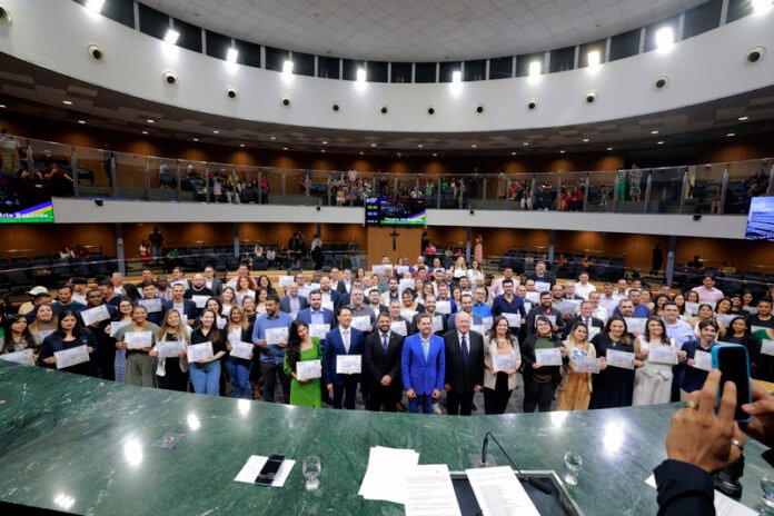 A Assembleia Legislativa de Goiás (Alego), por iniciativa do presidente Bruno Peixoto (UB), realizou na noite desta terça-feira, 20, sessão solene em homenagem ao Serviço Social da Indústria da Construção do Estado de Goiás (Seconci-GO). A instituição é uma associação civil autônoma sem fins lucrativos, que desempenha um papel crucial no setor da construção civil em Goiás, oferecendo serviços e programas que beneficiam os trabalhadores da área. Dessa forma, o Parlamento reconheceu a contribuição da entidade para a qualidade de vida, a saúde e a segurança no trabalho dos profissionais da construção. Na oportunidade, os homenageados receberam o Certificado do Mérito Legislativo das mãos de Peixoto.
