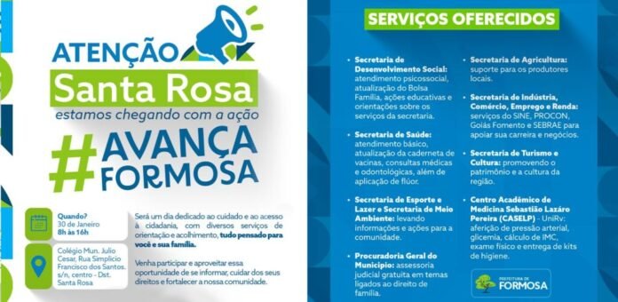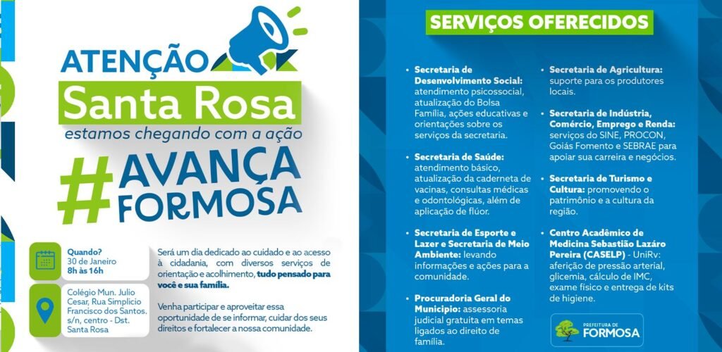 A Prefeitura de Formosa tem o prazer de anunciar que o projeto #AvançaFormosa estará no distrito de Santa Rosa no dia 30 de janeiro, das 8h às 16h, no Colégio Municipal Júlio César, localizado na Rua Simplício Francisco dos Santos, s/n, Centro.