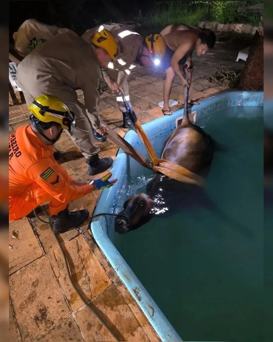 Bombeiros militares resgataram uma vaca que caiu em uma piscina na zona rural de Goianira (GO), na noite de sábado (07/03/2026). O salvamento ocorreu sem ferimentos aparentes ao animal, que foi devolvido ao responsável.