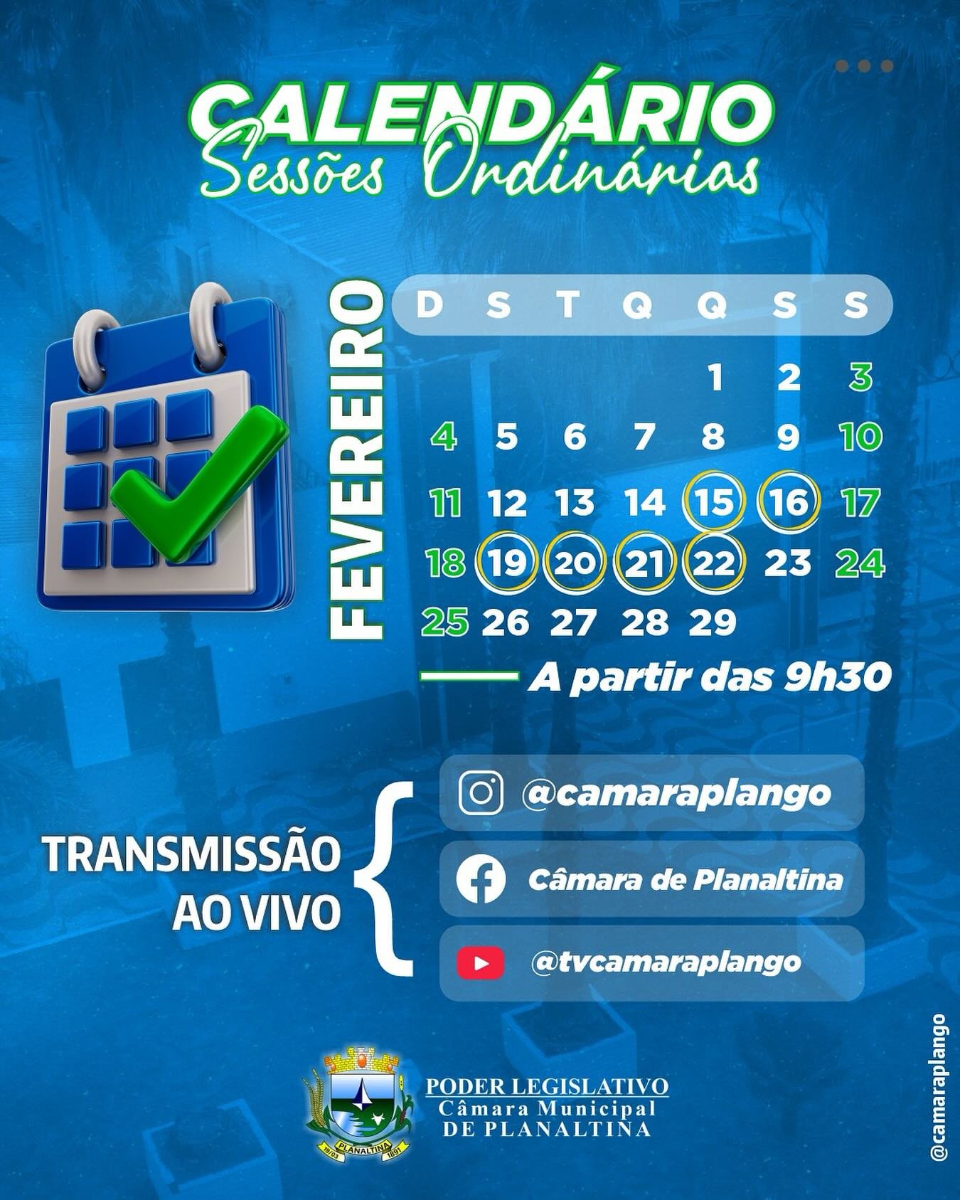 Você pode acompanhar as sessões aqui no Plenário Elisio Vaz ou através das nossas redes sociais.