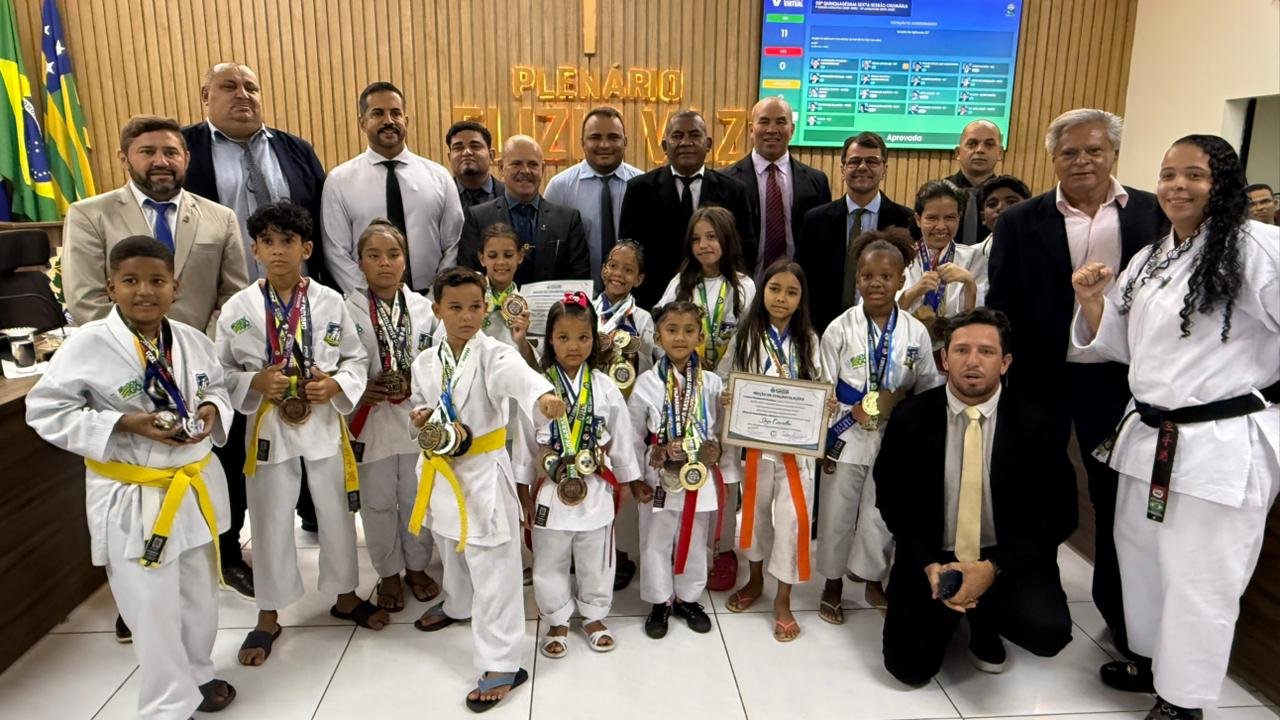 Vereadores e atletas de karatê do projeto “CONSTRUINDO CAMPEÕES DOJÔ CARVALHO” – entrega de moções de aplausos concedidas pelo vereador Tel – Foto: Alefe Bacelar