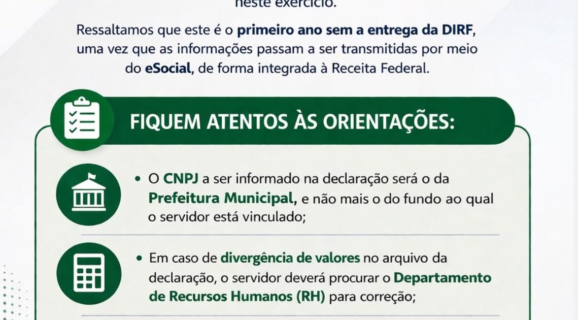 A Prefeitura Municipal informa que houve alterações no procedimento referente à declaração do IRRF (Imposto de Renda Retido na Fonte) neste exercício.