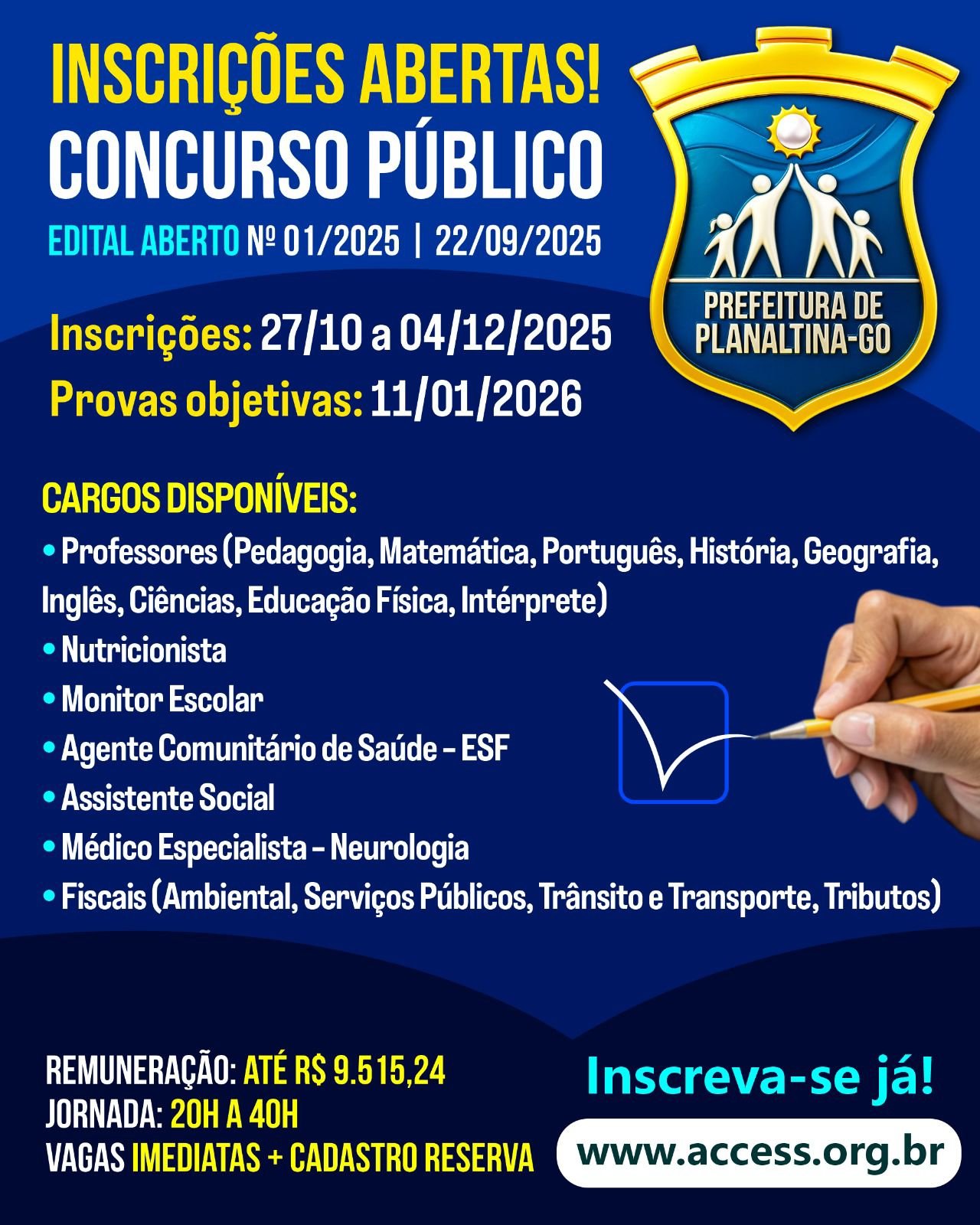 A Prefeitura Municipal de Planaltina de Goiás torna público o Edital nº 01/2025, lançado em 22 de setembro de 2025, que abre inscrições para o Concurso Público com vagas em diversas áreas da administração municipal.