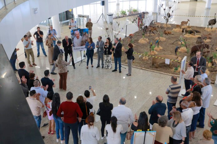 Lobo-guará, onça-pintada, onça-parda, jaguatirica, tatu-canastra, tamanduá-bandeira, veado-mateiro, anta, emas, siriemas, garças, araras azuis, canindés e vermelhas, tucanos, ariranha. Essa pequena e rica representação da diversidade da fauna do Cerrado passa a recepcionar os trabalhadores e visitantes da Assembleia Legislativa do Estado de Goiás (Alego) a partir de hoje, segunda-feira, 2. Trata-se da exposição “Cerrado: Berço das Águas e da Biodiversidade”, que foi inaugurada nesta manhã, no saguão de entrada da Casa Legislativa, e segue disponível até o final da semana.