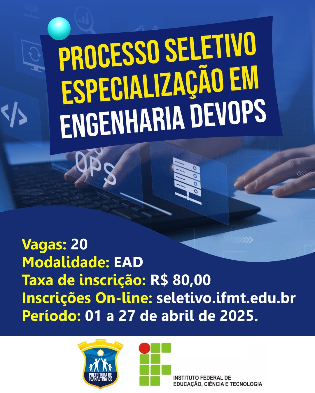 No período de 01 de abril a 27 de abril de 2025, estarão abertas as inscrições para o processo seletivo do curso de pós-graduação lato sensu em Engenharia Devops, na modalidade a distância, ofertado no Polo UAB em Planaltina-GO em parceira com IFMT/UAB..
