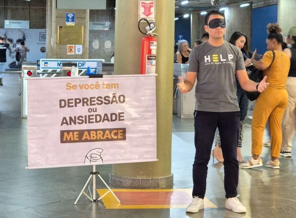 O jovem de braços estendidos leva uma venda nos olhos. Está imóvel no espaço que dá acesso à Estação Central da Companhia do Metropolitano (Metrô-DF). A cena, registrada nesta quinta-feira (20), é curiosa. Na correria de quem vai e de quem vem, muitos nem notam que o estudante Vinícius Cury, 22 anos, está ali, pronto para o abraço. Ao seu lado, há uma placa que convida: “Se você tem depressão ou ansiedade, me abrace”.