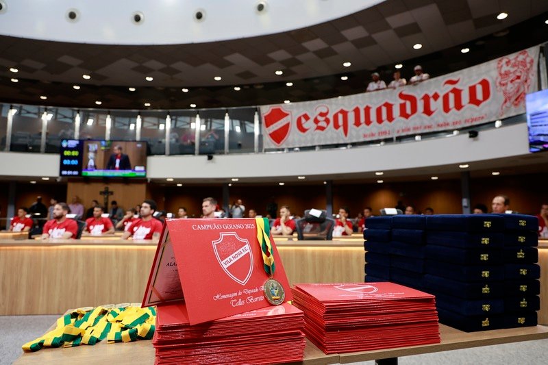 Homenagem ao time de futebol campeão goiano de 2025, Vila Nova Futebol Clube, com entrega da Medalha Pedro Ludovico Teixeira a atletas e membros da comissão técnica. Foi o que aconteceu na manhã desta terça-feira, 8, no Plenário Iris Rezende da Assembleia Legislativa de Goiás (Alego), em sessão solene proposta pelo deputado Talles Barreto (UB), com a presença de torcedores e familiares do elenco colorado.