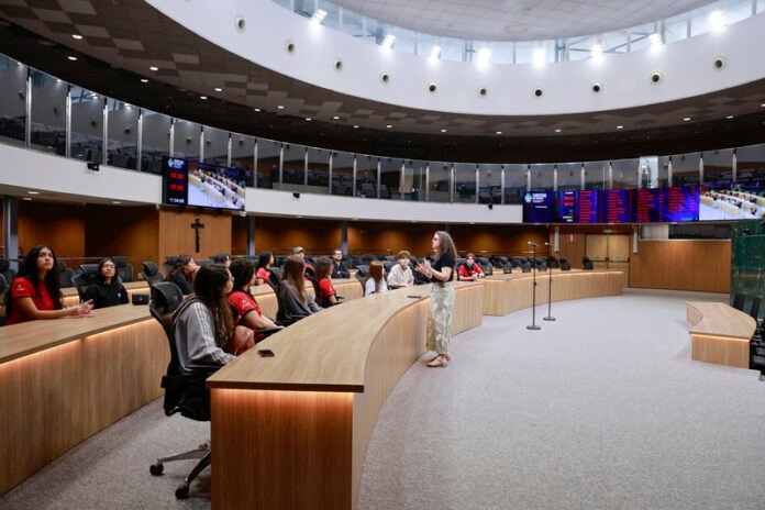 Na sequência, os jovens foram guiados pela analista legislativa e psicóloga organizacional Maria Elisa Duarte e fizeram um tour pelas instalações do Palácio Maguito Vilela: salas das comissões, plenário, gabinetes parlamentares, bloco C e galeria dos ex-presidentes.