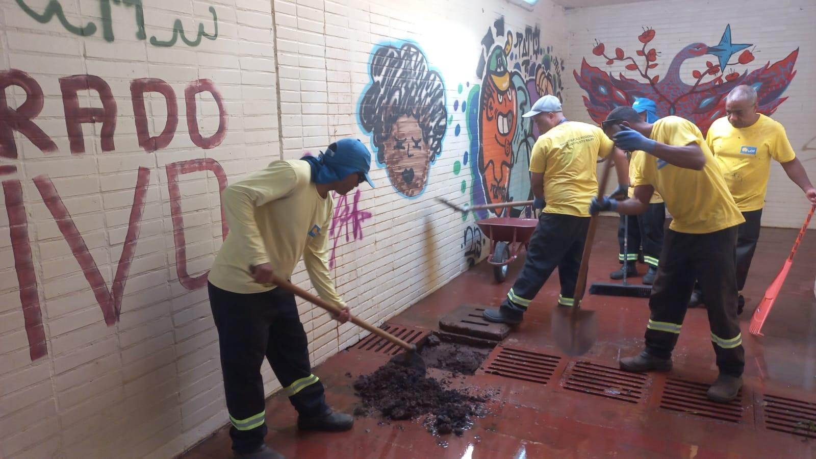 Depois do temporal que atingiu Brasília na madrugada desta sexta (14), as canaletas da passagem subterrânea da 105 Sul passaram por limpeza | Foto: Divulgação/Administração do Plano Piloto