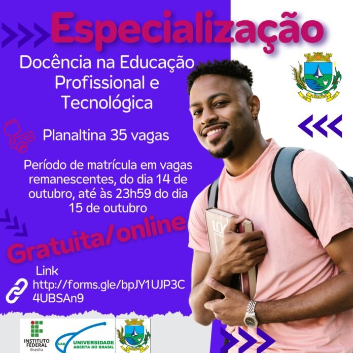 O instituto federal de Brasília lançou edital para especialização (pós-graduação lato sensu) em docência na educação profissional e tecnológica – docente voltada para profissionais da educação que atuam na educação profissional e tecnológica (ept) no distrito federal e em goiás. O curso é gratuito e a distância com alguns encontros presenciais previamente agendados, ocorrendo preferencialmente aos sábados.